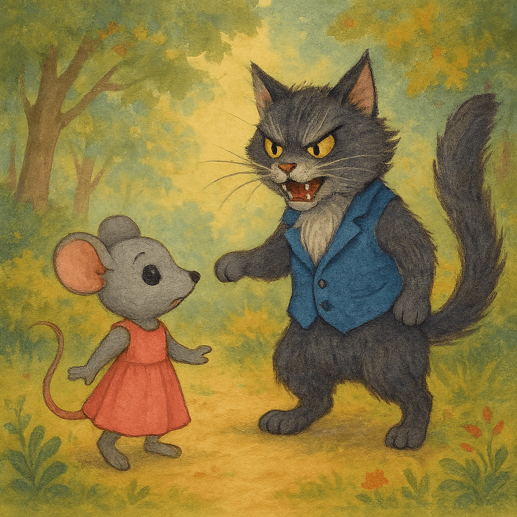 Мышка Мауси и кот Котауси на лесной полянке напротив друг друга, кот машет хвостом, Мауси осторожничает.