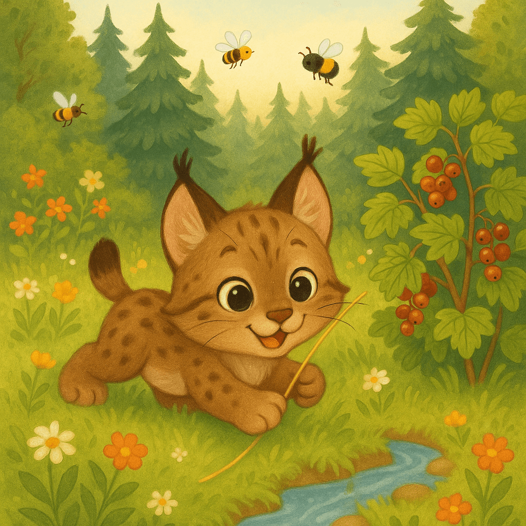Сказка о маленьком рысенке, который играет на полянке, и неожиданной встрече охотника, который его заметил.