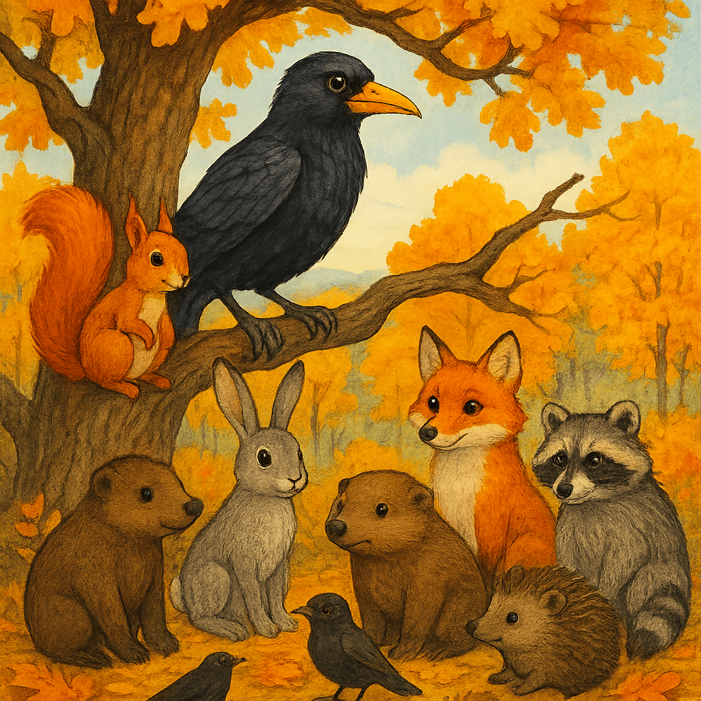 Сказка о мудром Вороне, который предупреждает лесных жителей о наступлении осени и учит их готовиться к холоду, теплу и предстоящей зимой, через дружбу и совместные дела.