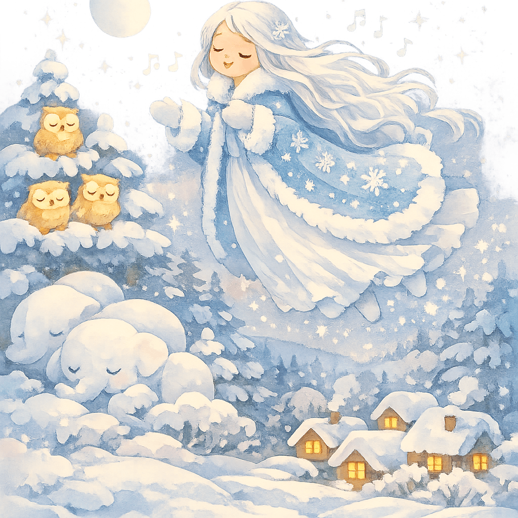 Лирическая зимняя сказка: ночь укрывает землю тёплым снегом, лес засыпает, совы дрёмлют, сугробы как белые слоны, и сама зима, напевая сказку, медленно засыпает.